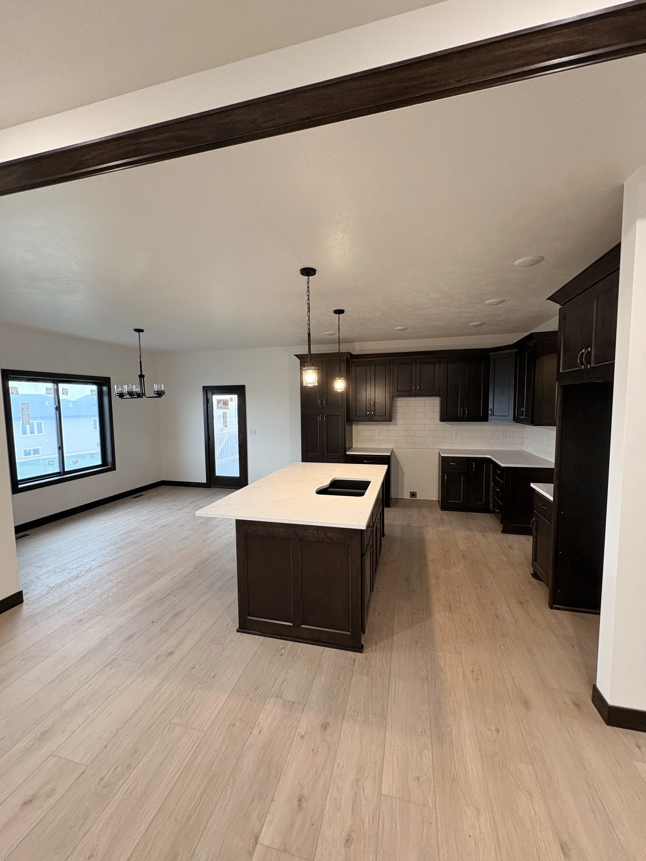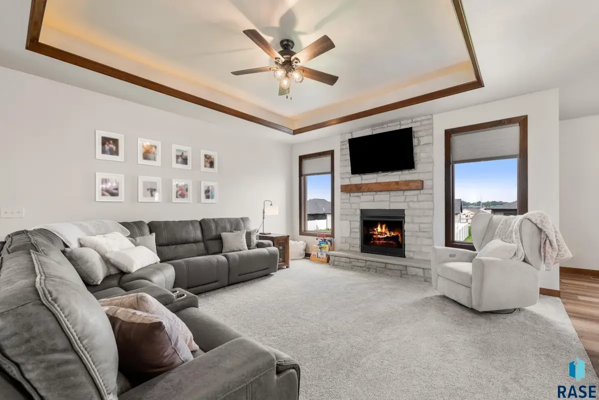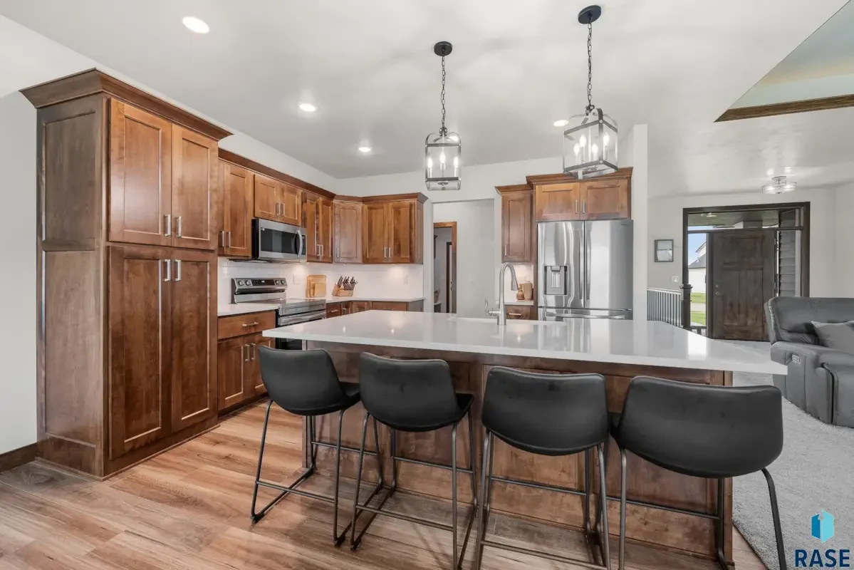 In demand style and modern comfort comes together in this beautifully designed 2023 ranch-style walk out. Nestled in a cul-de-sac within sought after new eastside development. 5 spacious bedrooms with 3 on the Main level, 3 oversized bathrooms featuring quartz tops, and a tiled en-suite shower. The kitchen has a large island, dining space, rich warm wood cabinets, sleek quartz countertops, ceramic backsplash, stainless steel appliances, and a farmhouse drop sink-perfect for both everyday living and entertaining. Generous windows invite sunlight to fill the living spaces with warmth and clarity. Enjoy the covered deck or have a campfire on the paver patio. A generous mudroom with custom warm wood lockers connects to the oversized 3-stall garage, which includes epoxy flooring, water hookups, and drain. 2 stone faced fireplaces, a massive family room with a wet bar. This home effortlessly blends the classics with today’s top design trends.