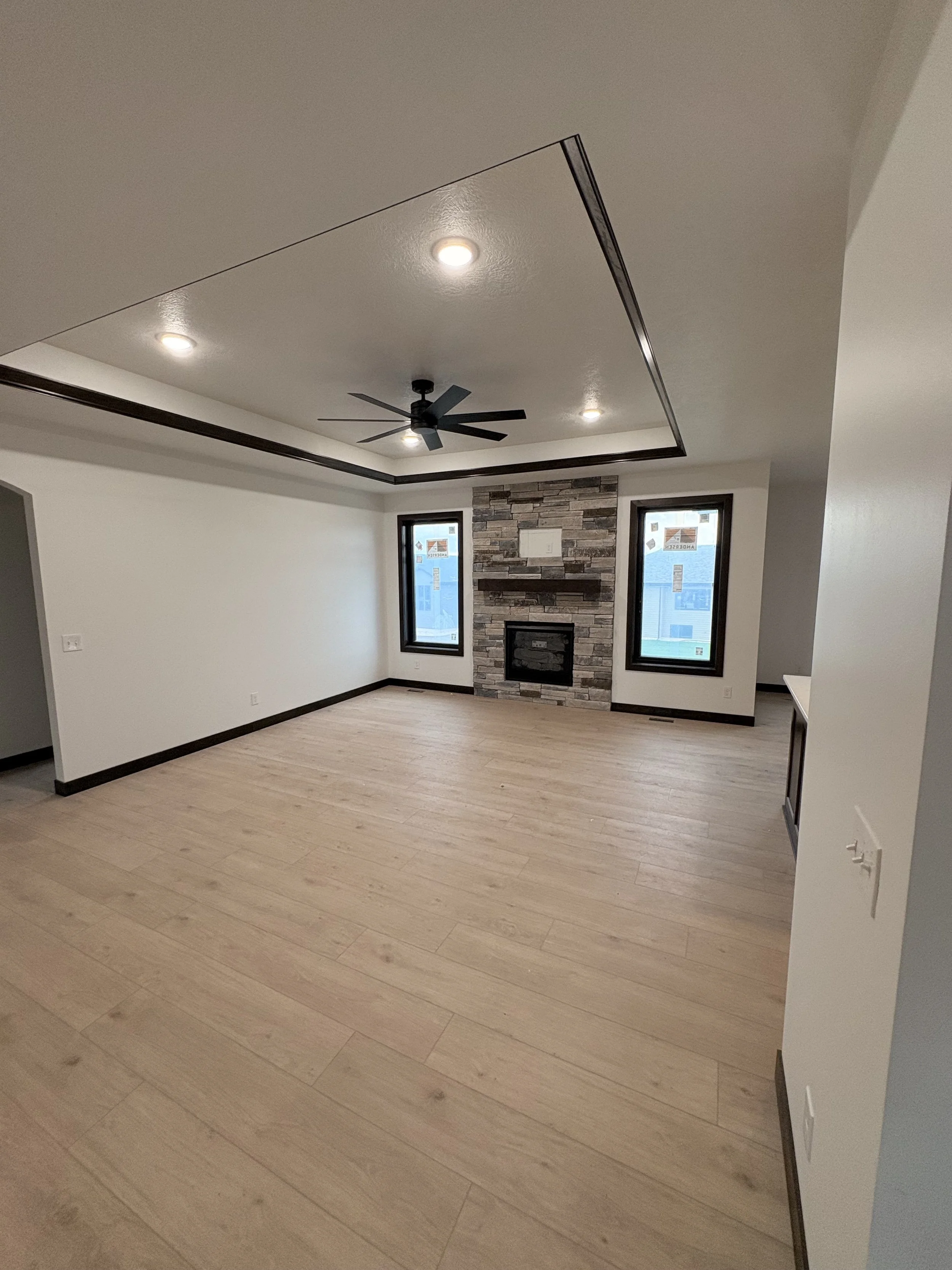 The gourmet kitchen boasts quartz countertops, premium stainless-steel appliances, and a spacious island—perfect for entertaining. The primary suite offers a spa-inspired bathroom with dual vanities, a tiled shower, and a walk-in closet. Upstairs, the stone-accented fireplace in the living room creates a warm, inviting space ideal for gatherings.